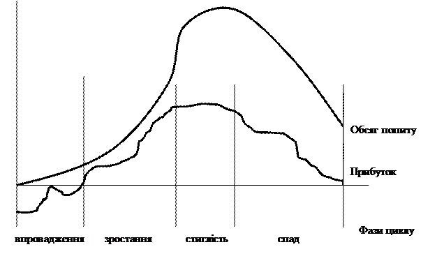 Розглянемо характеристики кожної фази циклу: 1. Фаза впровадження товару. Збут: слабкий. Витрати: великі. Прибуток: від’ємний (збиток). Характеристика споживачів: новатори. Кількість конкурентів: невелика. Цілі: створити облік товару та ініціювати покупку. Стратегія: - основний варіант продукту; - використання ціноутворення за витратами; - селективний розподіл товару; - акцент на створення обліку товару серед новаторів у рекламі; - створення інформації про товар. 2. Фаза зростання. Збут: швидко зростаючий. Витрати: середні. Прибуток: постійно зростаючий. Характеристика споживачів: масовий ринок. Кількість конкурентів: постійно зростаюча. Мета: максимізувати долю ринку. Стратегія: - удосконалений продукт, пропозиція додаткових послуг; - ціна проникнення; - інтенсивний розподіл товару; - зосередження на масового споживача; - створення переваг у товарній марці. 3. Фаза стиглості. Збут: повільно зростаючий. Витрати: низькі. Прибуток: стабільно високий. Характеристики споживачів: масовий ринок. Кількість конкурентів: стабільно велика. Мета: максимізувати прибуток, зберігаючи незмінною долю ринку. Стратегія: - диференційований продукт; - конкурентне ціноутворення; - ще більш інтенсивна реклама товару; - основний акцент на відмінностях від товарів-конкурентів і на перевагах даного товару; - створення прихильності попиту до даної марки товару. 4. Фаза спаду. Збут: спадаючий. Витрати: низькі. Прибуток: спадаючий. Характеристика споживачів: консерватори. Кількість конкурентів: спадаюча. Мета: зменшити витрати, зберегти у покупців прихильність даної товарної марки. Стратегія: - позбутися слабких варіантів товару; - зниження ціни; - елективний збут: позбутися неприбуткових сегментів; - зменшення рівня витрат на рекламу до мінімального; - селективна дія на споживача.
