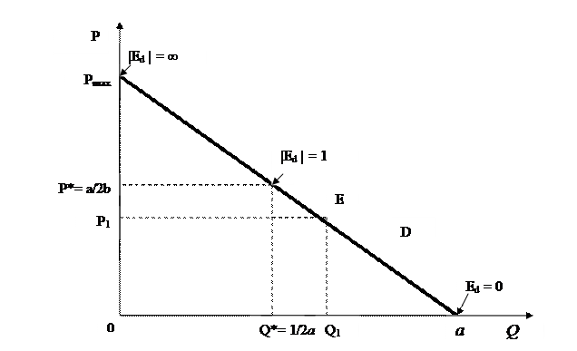 Дані формули можуть використовуватися також для визначення різних точок коефіцієнтів еластичності попиту за ціною. Залежність цінової еластичності попиту від ступеня насиченості потреби у товарі можна показати на прикладі лінійної функції попиту на рис 4.9.