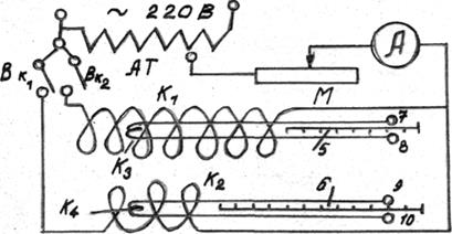 AT - автотрансформатор РНО-250-2, ВKI, Вк2 - выключатели обмоток соленоидов, K1 и K2 - соленоиды, Кз и К4 - пробные катушки, М - реостат, А - амперметр, 5 и 6 -штоки с измерительными шкалами; 7, 8, 9 и 10 - клеммы подключения пробных катушек к электронному осциллографу