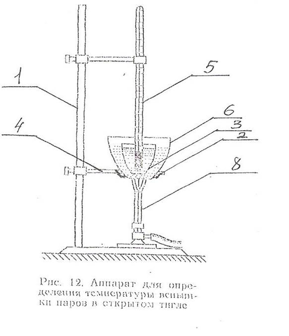 Ход работы Для определения вспышки масла железный тигель промывают бензином, прогревают над пламенем газовой горелки, охлаждают до 15-25°С и устанавливают в баню с прокаленным песком так, чтобы песок доходил до высоты около 12 мм от края тигля, а между дном и наружной чашкой находился слой песка 5-8 м. Предварительно обезвоженный нефтепродукт наливают в тигель 3 так, чтобы уровень жидкости отстал от края тигля на 21 мм для масла с температурой вспышки до 210°С включительно и на 18 мм для масла с температурой вспышки выше 210°С. Затем проверяют шаблоном правильно ли налито масло. Прибор помещают в таком месте лаборатории, где нет заметного движения воздуха и где свет настолько заметен, что вспышка хорошо видна. В тигель 3 с нефтепродуктом опускают термометр и закрепляют в строго вертикальном положении, чтобы ртутный шарик находился в центре тигля приблизительно на одинаковом расстоянии от дна тигля и от верхнего уровня нефтепродукта. Баню нагревают пламенем газовой горелки, которое регулируют так, чтобы испытуемый нефтепродукт нагревался на 10° в 1 минуту. За 40° до ожидаемой температуры вспышки скорость нагрева ограничивают 4° в 1 минуту. Испытание начинают за 10° до предполагаемой температуры вспышки. Через каждые 2° подъема температуры медленно проводят газовым пламенем над тиглем на расстоянии 12 мм от поверхности испытуемого продукта. Длина пламени зажигаемого приспособления должна быть 3-4 мм. Время проведения пламени от одного края тигля до другого - 2 - 3 секунды. За температуру вспышки принимают температуру показываемую термометром при появлении синего пламени над частью или над всей поверхности испытуемого нефтепродукта. Допустимое расхождение вспышки между двумя параллельными определениями не должно превышать 4°С при температуре вспышки до 150°С и 6°С при температуре вспышки выше 150°С.