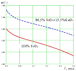 Материальная дисперсия Dmat определяется дисперсионными характеристиками материалов, из которых изготовлена сердцевина оптического волокна – кварца и легирующих добавок. Спектральная зависимость показателя преломления материала сердцевины и оболочки (рис. 1.24) вызывает изменения с длиной волны и скорости распространения. Достаточно часто данная зависимость описывается известным уравнением Селлмейера, которое имеет следующий вид: