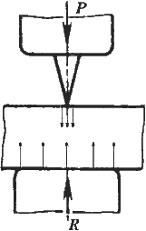 Биллетирование – превращение слитка в болванку или заготовку: включает сбивку ребер и устранение конусности. Обжатие при биллетировании составляет 5…20 %. Проковка слитка предназначена для обжатия металла в углах слитка с целью предварительного деформирования литой структуры – дендритов, которые имеют стыки в этих углах. Биллетирование способствует заварке воздушных пузырей и других подкорковых дефектов литой структуры, созданию пластичного поверхностного слоя металла, благоприятно влияющего на дальнейшую деформацию. После биллетирования производят обрубку донной части слитка. Рубка – применяется для отделения от основной заготовки негодных частей или для разделения заготовки на части. Рубка производится в холодном и горячем состоянии. В холодном состоянии рубят тонкие и узкие полосы и прутки сечением 15…20 мм. Более толстые заготовки нагревают. Схема рубки основана на действии деформирующей силы на малую площадь соприкосновения инструмента с заготовкой, а реакция этой силы со стороны нижней части распределена по большой поверхности заготовки, и пластической деформации здесь не возникает.