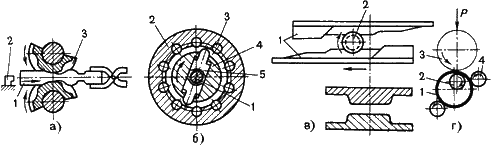 Рис.14.5. Схемы действия ковочных вальцов (а), ротационно-ковочной машины (б), станов поперечно-клиновой прокатки (в); раскатки (г)