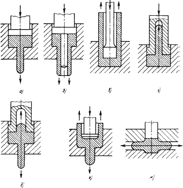 Рис. 15.3. Схемы выдавливания: а, б – прямого; в, г – обратного; д, е – комбинированного; ж - бокового