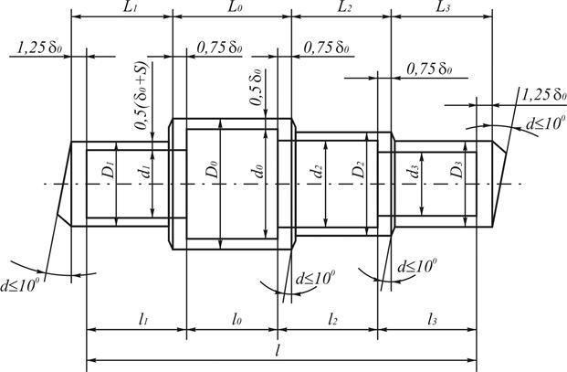 1. Проектирование поковки заключается в назначении припусков на механическую обработку и напусков, упрощающих процесс ковки. Рекомендуется следующая последовательность конструирования поковки; а) назначают конструктивные напуски, т.е. упраздняют мелкие конструктивные элементы (фаски, канавки, впадины зубьев и т.п.) и вычерчивают тонкими линиями упрощенный контур вала, состоящий из 4-х цилиндрических участков (ступеней), причем нулевой индекс присваивают участку с наибольшим диаметром (рис.1); б) назначают в соответствии с ГОСТ 7829-70 основные и дополнительные припуски на механическую обработку: - вначале назначают основные припуски - затем определяют дополнительные припуски