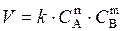 Скоростью реакции называется изменение концентрации какого-либо из веществ, вступающего в реакцию или образующегося при реакции, за единицу времени. Скорость химических реакций зависит от природы реагирующих веществ, их концентрации, температуры, присутствия катализаторов. Зависимость скорости реакции от концентрации реагирующих веществ выражается законом действия масс: при постоянной температуре скорость химической реакции прямо пропорциональна произведению концентраций реагирующих веществ. В общем случае для реакции nA + mB = pАВ зависимость скорости реакции от концентрации выражается уравнением