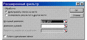 Рисунок 1 Для накладення розширеного фільтра, необхідно помістити курсор всередині основної таблиці і вибрати в меню Даные опції Фильтр і Расширенный фильтр. При цьому в поле Исходный диапазон (рисунок 1) буде автоматично занесене діапазон комірок вхідної таблиці. Для занесення діапазону комірок допоміжної таблиці у поле Диапазон условий, потрібно установити курсор у це поле, а потім виділити мишкою допоміжну таблицю разом з шапкою. При бажанні можна задати також діапазон комірок, куди треба помістити результати фільтрації, якщо ви не хочете фільтрувати список на місці. Є також можливість відображати в результатах тільки унікальні записи. Тобто, якщо таблиця містить записи, що повторюються, то результат фільтрації міститиме тільки по одному екземплярові кожного з них. Для зняття розширеного фільтра потрібно вибрати в меню Данные опції Фильтр і Отобразить все.