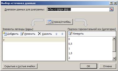 З метою формування рядів даних необхідно скористатися областю Элементы легенды (Ряды) даного діалогового вікна. Тут можна виконати детальну настоянку рядів даних, додавання нових (кнопка Добавить) або видалення тих, що є (кнопка Удалить). Так, якщо виділити ряд даних і натиснути кнопку Изменить, то відкриється вікно Изменение ряда, в якому можна вказати адресу осередку, з якого буде узято ім'я ряду даних, або ввести його безпосередньо з клавіатури (поле Имя ряда).