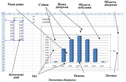 У полі Значение указується діапазон осередків, з яких формується ряд даних, використовуваних як початкові дані при побудові діаграми. У поле Подписи горизонтальной оси (Категории) вводяться назви категорій, що є підписами по осі Х. В процесі редагування можна змінити колір і стиль ліній, розміри діаграми, ціну ділень шкали, вид фігури ряду, перемістити текст і тому подібне. На малюнку показані основні елементи діаграми, які можна змінювати, добиваючись максимальної наочності і зручності її сприйняття.