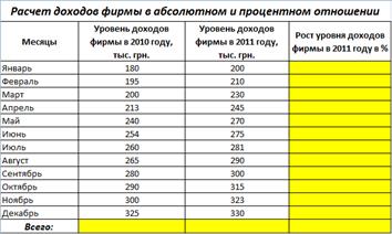 =(Ci-C$3)/C$3 де Сi – адреса чарунки i-го місяця графи «Уровень доходов фирмы в 2011 году», С$3 – абсолютна адреса чарунки «Уровень доходов фирмы за январь 2011 года»;