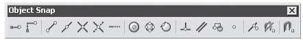 На панелі наведені всі види об'єктних прив'язок, які є в пакеті AutoCAD. Панель інструментів Object Snap (Об'єктна прив'язка) містить наступні кнопки. Temporary track point (Точка відстеження). Створює тимчасову точку для об'єктної прив'язки до тимчасової допоміжної точки. Snap From (Відстеження). Дозволяє зробити прив'язку зі зсувом від іншої опорної точки. Snap to Endpoint (Кінцева точка). Робить прив'язку до кінцевої точки графічного об'єкта. Snap to Midpoint (Середина). Здійснює прив'язку до середини об'єкта або сегмента. Snap to Intersection (Перетинання). Викликає прив'язку до точки перетинання двох об'єктів. Snap to Apparent Intersect (Гадане перетинання). Викликає прив'язку до точки гаданого перетинання двох об'єктів, що перебувають у різних площинах. Даний вид прив'язки використовується в основному в тривимірному моделюванні. Snap to Extension (Продовження лінії). Викликає прив'язку до уявленого продовження лінійного або дугового сегмента. Snap to Center (Центр). Дозволяє зробити прив'язку до центру околі, дуги, еліпса або еліптичної дуги. Snap to Quadrant (Квадрант). Робить прив'язку до точки квадранта дуги, кола, еліпса або еліптичної дуги. Snap to Tangent (Дотична). Викликає прив'язку до точки на околі, сплайні, еліпсі, еліптичній дузі, у якій споруджуваний об'єкт буде для неї дотичній. Snap to Perpendicular (Нормаль). Дозволяє виконати прив'язку до точки, що розташована на перпендикулярі щодо іншого об'єкта. Snap to Parallel (Паралельно). Викликає прив'язку паралельно обраному графічному об'єкту. Snap to Insert (Точка вставки). Прив'язка до точки вставки тексту, блоку, атрибута. Snap to Node (Вузол). Здійснює прив'язку до об'єкта типу " точка". Snap to Nearest (Найближча). Дозволяє виконати прив'язку до найближчої точки об'єкта. Snap to None (Немає). Відключає режим об'єктної прив'язки для вказівки даної точки. Osnap Settings (Настроювання об ' єктної прив ' язки). Дозволяє робити настроювання поточних режимів об'єктної прив'язки. Зверніть увагу, що в рядку стану також перебуває кнопка об'єктних прив'язок OSNAP (ПРИВ'ЯЗКА), за допомогою якої можна управляти вмиканням / вимиканням заздалегідь певного набору об'єктних прив'язок. Вона дозволяє обирати певні точки в процесі редагування рисунка. Цій кнопці відповідає функціональна клавіша F3. Якщо режим об'єктної прив'язки активний, то користувач може вибрати тільки потрібний параметр і розмістити покажчик миші біля об'єкта, а програма сама розрахує координати розміщенняточки прив'язки.