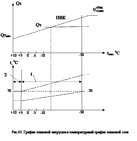 В схеме подогрева воды устанавливается пиковый водогрейный котёл. Подогреть воду в соответствии с необходимым температурным графиком можно и без ПВК. Это казалось бы выгодным, т.к. отпуск теплоты потребителям осуществлялся бы полностью из отборов. Из-за очень неравномерного графика тепловой нагрузки (зимой – максимальная, летом – минимальная) отборы Т1 и Т2 будут максимально загружены лишь в самую холодную пятидневку года, остальное время года они будут разгружены и эффективность работы ТЭЦ будет низкой, т. к. будет низка выработка электроэнергии на базе теплофикации. Большую часть года турбина будет работать с превалированием конденсационной выработки электрической энергии. Для увеличения эффективности выработки электрической энергии рассчитывают так, что теплом из отборов закрывается базовая часть тепловой нагрузки, а пиковая часть закрывается пиковым водогрейным котлом. То есть с 5оС нагрузка с отборов и ПСВ достигает номинала и держится такой длительный отопительный период (196 дней). При отпуске теплоты только из ПСВ недогружена не только турбина, но и энергетические котлы.