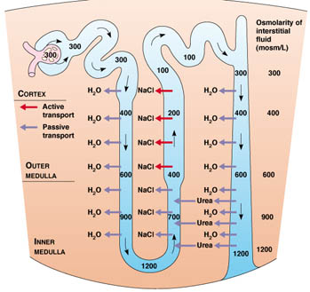 В зависимости от состояния водного баланса организма почки выделяют гипотоническую (осмотическое разведение) или, напротив, осмотически концентрированную (осмотическое концентрирование) мочу. В процессе осмотического концентрирования мочи в почке принимают участие все отделы канальцев, сосуды мозгового вещества, интерстициальная ткань, которые функционируют как поворотно-противоточная множительная система. Функциональное значение различных отделов петли нефрона неоднозначно. Поступающая из проксимального канальца, в тонкий нисходящий отдел петли нефрона жидкость попадает в зону почки, в интерстициальной ткани которой концентрация осмотически активных веществ выше, чем в корковом веществе почки. Вода всасывается из просвета канальца в окружающую интерстициальной ткань по осмотическому градиенту, а осмотически активные вещества остаются в просвете канальца. Их концентрация составляет уже около 200 мосмоль/кг Н2О, т. е. она ниже, чем в ультрафильтрате. Чем дальше от коркового вещества по длиннику почечного сосочка находится жидкость в нисходящем колене петли, тем выше ее осмоляльная концентрация. Вдоль мозгового вещества почки осмоляльная концентрация жидкости в просвете канальца и в интерстициальной ткани постепенно растет от 300 до 1450 мосмоль/кг Н2О. На вершине мозгового вещества почки осмоляльная концентрация жидкости в петле нефрона возрастает в несколько раз, а ее объем уменьшается. При дальнейшем движении жидкости по восходящему отделу петли нефрона, особенно в толстом восходящем отделе петли, продолжается реабсорбция С1- и Na+, вода же остается в просвете канальца. В начальные отделы дистального извитого канальца всегда — и при водном диурезе, и при антидиурезе — поступает гипотоническая жидкость, концентрация осмотически активных веществ в которой менее 200 мосмоль/кг Н2О. Прямые сосуды мозгового вещества почки, подобно канальцам петли нефрона, образуют противоточную систему. При прохождении крови по прямым сосудам наблюдаются такие же изменения ее осмотической концентрации, как и в тонком нисходящем отделе петли нефрона. При движении крови по направлению к вершине мозгового вещества концентрация осмотически активных веществ в ней постепенно возрастает, а во время обратного движения крови к корковому веществу соли и другие вещества, диффундирующие через сосудистую стенку, переходят в интерстициальную ткань. Тем самым сохраняется градиент концентрации осмотически активных веществ внутри почки и прямые сосуды функционируют как противоточная система. Таким образом, деятельность петли нефрона, конечных частей дистального сегмента и собирательных трубок обеспечивает способность почек вырабатывать большие объемы разведенной (гипотонической) мочи — до 900 мл/ч, а при дефиците воды экскретировать всего 10—12 мл/ч мочи, в 4, 5 раза более осмотически концентрированной, чем кровь. Способность почки осмотически концентрировать мочу исключительно развита у некоторых пустынных грызунов, что позволяет им длительное время обходиться без воды. Количество, состав и свойства мочи. Диурезом называют количество мочи, выделяемое человеком за определенное время. При обычном водном режиме за сутки выделяется 1—1, 5 л мочи. Концентрация осмотически активных веществ в моче зависит от состояния водного обмена и соста
