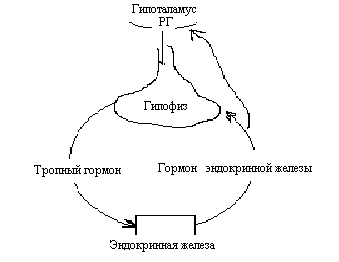 В механизме действия гормон-рецепторного комплекса таких гормонов обязательно участвуют посредники, которые индуцируют ответ клетки. Наиболее важные из таких посредников — цАМФ (циклический аденозинмонофосфат), инозитолтрифосфат, ионы кальция. Участие ионов кальция как посредника обеспечивает воздействие на клетки таких гормонов, как вазопрессин и катехоламины. Выполнив свою задачу, гормоны либо расщепляются в клетках-мишенях или в крови, либо транспортируются в печень, где расщепляются, либо, удаляются из организма в основном с мочой (например, адреналин). 3. Для поддержания соответствующей концентрации гормона, эндокринный орган постоянно должен получать " информацию" о системной концентрации гормона или какой либо его функции. Эта " информация" поступает в эндокринную систему благодаря существованию механизма обратной связи, которая обеспечивает передачу сведений о периферической концентрации гормона в крови обратно в секретирующий орган. Система отрицательных обратных связей принимает участие в регуляции секреции буквально всех эндокринных органов. Положительная обратная связь проявляется значительно реже, но она также имеет место при определенных эндокринных состояниях. Каждый тропный гормон передней доли гипофиза находится под отрицательным контролем гормонов, которые секретируются их органами-мишенями. Контролируемой переменной является концентрация гормонов в плазме, секретируемых органом-мишенью (надпочечники, гонады или щитовидная железа). Скорость секреции гормона регулируется стимулирующим действием тропного гормона, вырабатываемого передней долей гипофиза, которая, в свою очередь, регулируется рилизинг-гормоном, секретируемым нейронами гипоталамуса. Этот отдел мозга содержит: 1) нейроны, способные реагировать на изменение концентрации в крови гормонов из органов-мишеней; 2) нулевую точку отсчета, соответствующую нормальной концентрации этих гормонов в крови. Гипоталамус сравнивает эти два значения и, если концентрация циркулирующего гормона из органа-мишени меньше нулевой точки отсчета (нормальной концентрации), он увеличивает секрецию соответствующего рилизинг-гормона. Это повышает секрецию тропного гормона, который стимулирует секреторную активность органа-мишени до тех пор, пока концентрация гормона в плазме, вырабатываемого этим органом, не вернется к нормальному уровню. Аналогично, если концентрация гормона в плазме превышает некий определенный уровень, каскад реакций претерпевает обратные изменения, и концентрация гормона падает. При этом гормоны из органов-мишеней обнаруживают отрицательную обратную связь, и их секреция подавляется в результате снижения секреции тропных или рилизинг-гормонов или снижения секреции тех и других.