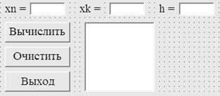 Метки Label1, Label2, Label3, которые переименовать соответственно на xn, xk та h с соответствующими свойствами Font (шрифт) – Синий, размером 14, жирный. Для этого одновременно отделим пять объектов: держа нажатой клавишу Shift, поочередно активизируйте объекты, щелкая на них левой клавишей мыши. Очистите поле редактирования Label1, Label2, Label3 -для этого удалите значение свойства Text для объектов. Метки Button1, Button2, BitBtn1, которые переименовать соответственно на Вычислить, Очистить и Выход по соответствующим свойствам Font (шрифт) – Черный, размером 16, жирный. 1. Нажимаем двойным щелчком мыши на кнопке Button1 и впишем в открытый метод обработки нажатия TForm1.BitBtn1Click такие строки: procedure TForm1.Button1Click(Sender: TObject); var Form1: TForm1; y, xn, xk, h, t, x: real; begin xn: =strtofloat(Edit1.Text); xk: =strtofloat(Edit2.Text); h: =strtofloat(Edit3.Text); x: =xn; repeat t: =x-1; if t< 0 then memo1.Lines.Add('x='+FormatFloat('0.00', x)+' Нет решения') else begin y: =sqrt(t)+cos(3*x); memo1.Lines.Add('x='+FormatFloat('0.00', x)+' y='+FormatFloat('0.00', y)); end; x: =x+h; until x> xk; end; 2. Нажимаем двойным щелчком мыши на кнопке Button1 и впишем в открытый метод обработки нажатия TForm1.BitBtn1Click такие строки: procedure TForm1.Button2Click(Sender: TObject); begin memo1.Lines.Clear; end; 3. Нажимаем двойным щелчком мыши на кнопке Button1 и впишем в открытый метод обработки нажатия TForm1.BitBtn1Click такие строки: procedure TForm1.BitBtn1Click(Sender: TObject); begin Close; end; end. 1. Скомпилировать созданный проект функциональной клавишей F9. 2. Проверить работоспособность программы по своиму варианту. 3. Сохранить созданный проект командой File-Save Project As… в папке 1 курс – папка вашей специальности - файл ПР_19