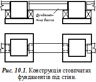 Cтрічкові фундаменти під стіни. Такі фундаменти виготовляють збірними, монолітними чи збірно-монолітними. Збірні фундаменти складаються з залізобетонних плит, на які опирається фундаментна стіна з бетонних блоків (рис. 10.2).