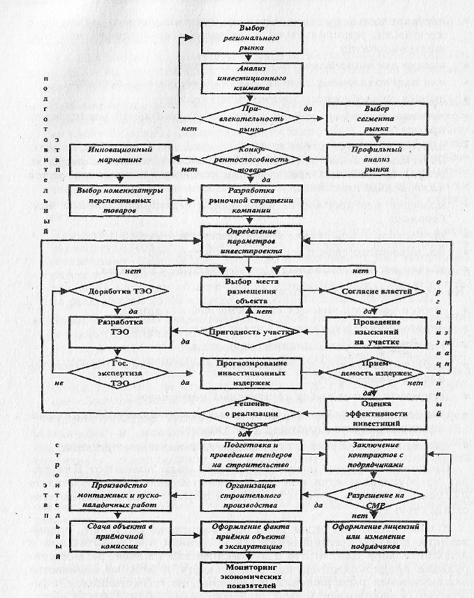 • Подготовительный этап, когда Инвестор на основе анализа инвестиционного климата в регионе проводит исследование возможностей рынка, формирует инвестиционный замысел, принимает решение о выходе на конкретный рынок, разрабатывает стратегию поведения на рынке, оценивает свои инвестиционные возможности и определяет приемлемые параметры инвестиционного проекта (производственные показатели, стоимость, сроки реализации и т.п.). На этот этап приходится от 3% до 8% общих затрат. • Проектно-организационный этап, включающий выбор места размещения объекта (предприятия), разработку и согласование обоснования инвестиций, проектной документации, получение разрешения на строительство (реконструкцию или расширение), принятие решения об источниках финансирования. На этом этапе расходуется до 20% средств от общей стоимости проекта. • Этап собственно строительства (реконструкции, расширения) объекта (предприятия) и ввода его в эксплуатацию. На этом этапе анализируется рынок строительных услуг, готовится контрактная документация, организуется строительное производство. Самый затратный этап. На него приходится до 72% общей стоимости (60% на строительно-монтажные работы и приобретение оборудования и 12% - на наладку и пуск в эксплуатацию). Часто Инвестор выделяет ещё этап производственной деятельности и мониторинга экономических показателей, поскольку для него инвестиционный проект заканчивается не пуском объекта в эксплуатацию, а достижением тех экономических показателей, ради которых этот проект и затевался. Подготовительный этап инвестиционного цикла, как первая стадия инвестиционного проектирования, предполагает проведение работ по: • выбору перспективного регионального рынка; • проведению полномасштабного маркетингового исследования (спрос и предложение, сегментация рынка, оценка уровня базовых, текущих и прогнозных цен на продукцию (услуги), эластичность спроса, основные конкуренты, их маркетинговая стратегия, программа удержания продукции на рынке и т.п.); • предварительному обоснованию инвестиционного замысла; • предварительному согласованию инвестиционного замысла с местными, региональными и федеральными органами исполнительной власти; • оценке предполагаемого объема инвестиций; • анализу возможных источников финансирования проекта; • оценке потребности в иностранной валюте; • предварительному отбору организации, способной реализовать проект; • инновационному, патентному и экологическому анализу технических решений (технологий, объектов техники, ресурсов, услуг), организация производства которых предусматривается намечаемым проектом; • проверке необходимости выполнения сертификационных требований; • предварительной оценке эффективности инвестиций; • планированию сроков осуществления проекта; • оценке рисков, связанных с осуществлением проекта. На этом же этапе проводятся: • оценка инвестиционных возможностей компании, • определяются параметры инвестиционного проекта, • определяются условия инвестирования, • подготавливаются инвестиционные предложения для потенциальных инвесторов; • осуществляется выбор конкретных инвесторов; • готовятся предложения по организационно-правовой форме реализации проекта и составу участников; • формулируются условия прекращения реализации проекта. Пр