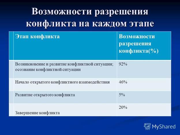 2. Негативные Каждый конфликт имеет свою причину (источник) возникновения. Причины, порождающие конфликты, можно сгруппировать: *Недостаточная согласованность и противоречивость целей отдельных групп и работников. Чтобы избежать конфликта, необходимо уточнить цели и задачи каждого подразделения и работника, передав соответствующие предписания в устной или письменной форме. Довольно часты столкновения линейного руководства с функциональными службами, обусловленные плохим товароснабжением, неритмичностью поставок, низкой трудовой дисциплиной, способы предотвращения которых со всей очевидностью вытекают из характера самих недостатков. *Устарелость организационной структуры, нечеткое разграничение прав и обязанностей. Следствием этого является двойное или тройное подчинение исполнителей *Ограниченность ресурсов. Даже в самых крупных организациях ресурсы всегда ограничены. Руководство решает, как правильно распределить материалы, людские ресурсы и финансы между различными группами, чтобы достигнуть целей организации. Выделение большей доли ресурсов одним будет означать недополучение их другими членами коллектива, что вызовет их недовольство и приведет к различным видам конфликта. *Недостаточный уровень профессиональной подготовки. В этом случае возможность возникновения конфликта обусловлена профессиональной неподготовленностью подчиненного. Ему не доверяют выполнение отдельных видов работ, которые выполняет другой сотрудник. В результате этого одни работники недогружены работой, а другие перегружены ею. *Необоснованное публичное порицание одних и незаслуженная (авансированная) похвала другим сотрудникам. В результате этого появляются «доверенные лица» и «любимчики». Такое положение всегда провоцирует конфликт. *Противоречие между функциями, входящими в круг должностных обязанностей работника, и тем, что он вынужден делать по требованию руководителя. Особенно остро проявляется это противоречие тогда, когда руководитель придерживается бюрократических процедур. *Различия в манере поведения и жизненном опыте. Встречаются люди, которые постоянно проявляют агрессивность и враждебность по отношению к другим и готовы оспаривать каждое их слово. Такие люди и создают вокруг себя конфликтную ситуацию. Различия в жизненном опыте, нравственных ценностях, образовании, стаже работы, возрасте и социальных характеристиках уменьшают степень взаимопонимания и сотрудничества между членами трудового коллектива. *Неопределенность перспектив роста. Если сотрудник не имеет перспективы роста или сомневается в ее возможности, то работает он без энтузиазма, а трудовой процесс становится для него тягостным и бесконечным. В таких условиях вероятность конфликта наиболее очевидна. *Неблагоприятные физические условия. Посторонний шум, жара или холод, неудачная планировка рабочего места тоже могут служить причиной конфликта. *Недостаточность благожелательного внимания со стороны менеджера. Причиной конфликта могут быть нетерпимость менеджера к справедливой критике, невнимание к нуждам и заботам подчиненных, публичный «разнос» и т.п. *Психологический феномен. Это постоянное чувство обиды и зависти (у других все лучше, другие удачливее, счастливее и т.д.). Исследователи выделяют несколько этапов в развитии конфл