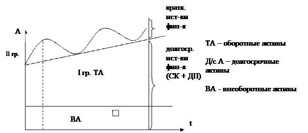 Для определения потребностей в финансовых источниках выделяется две группы текущих активов: 1) группа низкой ликвидности, потребность в покрытии которой постоянна; 2) группа высоколиквидных активов с периодической потребностью в финансировании. При выборе источников финансирования следует поддерживать балансовое соотношение: долгосрочные источники финансируют постоянные, устойчивые активы (рис.5). Рис.5 Активы фирмы и источники их финансирования