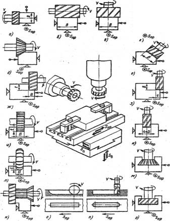 Вертикальные поверхности на горизонтально-фрезерных станках (рис.5.а) обрабатывают торцовыми насадными фрезами иди фрезерными головками, а на вертикально-фрезерных (рис.5.г) концевыми фрезами. Горизонтальные поверхности обрабатывают цилиндрическими фрезами на горизонтально-фрезерных станках (рис.5.б) и торцовыми насадными фрезами на вертикально-фрезерных станках (рис.5.в). Рис.5. Схемы фрезерования поверхности. Узкие наклонные поверхности на горизонтально-фрезерных станках получают (рис.5.д). Широкие наклонные поверхности удобнее обрабатывать на вертикально-фрезерных станках с поворотной шпиндельной головкой (рис.5.е) торцовой насадкой или концевой фрезами. Уступы и прямоугольные пазы на горизонтально-фрезерных станках обрабатывают соответственно дисковыми двухсторонними (рис.5.ж) и трехсторонними (рис.5, е), а на вертикально-фрезерных- концевыми (рис.5.з, к) фрезами. Фасонные поверхности обрабатывают фасонными фрезами (рис.5.л). Пазы типа «ласточкин хвост» и Т обрабатывают на вертикально-фрезерных станках: сначала фрезеруют прямоугольный паз концевой фрезой, а затем концевой угловой (рис.5.м) или Т-образной фрезой (рис.5.р). На горизонтально-фрезерных станках шпоночные пазы обрабатывают дисковыми фрезами (35, о), а на вертикально-фрезерных - концевыми или шпоночными (рис. 5, п). Одновременную обработку нескольких поверхностей выполняют набором фрез (рис. 5, и). [1]