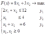 Пример: Предприятие может работать по двум технологиям. При этом используются два типа ресурсов. Запасы ресурсов составляют 12 тонн и 4 литра соответственно. За 1 час работы по первой технологии расходуется 2 тонны первого ресурса и 1 литр второго, а за 1 час работы по второй технологии – 1 тонна первого ресурса. 1 час работы по первой технологии приносит доход 8 тыс. руб., а по второй – 3 тыс. руб. Суммарное время работы по технологиям должно составлять 6-часовую смену. Определить время работы по каждой технологии так, чтобы суммарный доход был наибольшим. · Математическая модель