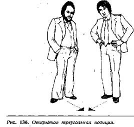 Якщо двоє співрозмовників стоять під кутом 90° і утворюють відкритий трикутник, то це – невербальне запрошення для третього (з тим самим статусом) приєднатися до розмови.