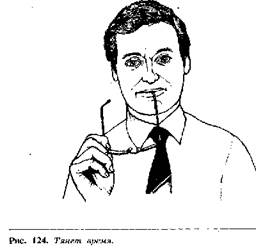 Оскільки розмовляти з предметом у роті складно, то людина начебто одержує тайм-аут, право відмовчуватися, крім того, це означає, що вона очікує надходження нової інформації. Швидке знімання окулярів і кидання їх на стіл є проявом обурення і неприйняття. За такої ситуації з'ясування головного питання слід відкласти до моменту, коли " співбесідник одягне знову окуляри і буде здатним вислухати альтернативи. Захисне погладжування шиї долонею. У багатьох ситуаціях, коли людина займає захисну позицію, рука рухається назад, ніби ховаючись від удару чи відсмикуючись від опіку, але це маскується тим, що долоня кладеться на потилицю.