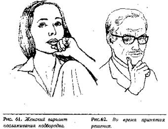 Жінки поєднують цей жест з поправлянням зачіски. Відвернення обличчя вбік («відвертати носа»). Це універсальний жест, який означає незадоволення і відкидання. Навіть діти «відвертають ніс» від їжі, що їм не подобається, відкидаючи голову назад, як від неприємного запаху. Аналогічний жест — погляд, спрямований вниз («дивитися собі під ніс»). Захват носа. Цей жест, поєднаний із закриванням тією самою рукою очей, демонструє зосередженість над прийняттям рішення. Почісування підборіддя. Воно свідчить про роздумування, оцінювання, сигналізуючи: «Дайте мені подумати, йде процес прийняття рішення». Часто супроводжується поглядом скоса, ніби бажанням здалеку побачити розв'язок проблеми.