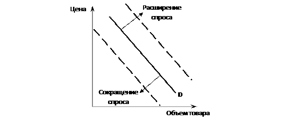 Увеличение рыночной цены приводит к сокращению объема спроса, в этом случае говорят о действии «ценового фактора». Графически данное изменение выражается в движении вдоль функции спроса (рис. 2.1). На спрос кроме цены влияют «неценовые факторы», они приводят к изменению спроса и графически их влияние выражается в сдвигах кривой спроса (рис. 2.2). Расширение спроса выражается в сдвиге кривой спроса вправо и вверх. Увеличение спроса означает, что при той же цене потребители готовы приобрести больше, а тот же объем продукции готовы приобрести по более высокой цене.