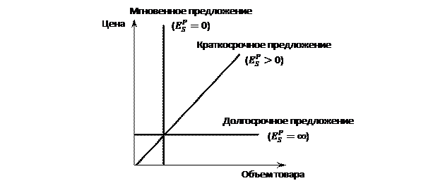 Важным фактором, влияющим на эластичность, является фактор времени. В экономической теории различают три функциональных периода (рис. 2.7.). 1. Мгновенный период – период, в течение которого фирма не может изменить объем выпуска, а предложение меняется только за счет изменения запасов готовой продукции. В этом периоде предложение неэластично, крайний случай – абсолютно неэластичное предложение ( 2. Краткосрочный период – период, в течение которого фирма может изменить объем выпуска в рамках существующих производственных мощностей, но не успевает изменить производство и технологию. В этом периоде коэффициент эластичности предложения больше нуля ( 3. Долгосрочный период – период, в течение которого фирма может реализовать любые решения (привлечение капитала, смена технологии, и т. д.). В долгосрочном периоде предложение становится абсолютно эластичным (