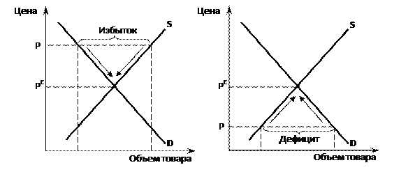 3. Рыночное равновесие и его устойчивость. Выгоды рыночного обмена Рыночное равновесие – такая ситуация, когда планы производителей и потребителей совпадают. Равновесие характеризуется тем, что ни у одной из сторон нет побудительных мотивов к изменению сложившейся ситуации. Рынок всегда стремится к точке равновесия (точке пересечения функции спроса и функции предложения). При нарушении равновесия на рынке начинают действовать механизмы восстановления равновесия (рис. 2.8). Если, по каким-либо причинам рыночная цена окажется выше равновесной, то объем предложения превысит объем спроса и на рынке образуется избыток, для реализации которого фирмы пойдут на снижение цены, что приведет к росту объема спроса и снижению объема предложения до равновесного уровня. Если, рыночная цена окажется ниже равновесной, то объем спроса превысит объем предложения и на рынке образуется дефицит, конкуренция среди потребителей приведет к росту цены, что в свою очередь, снизит объем спроса и повысит объем предложения до равновесного уровня.