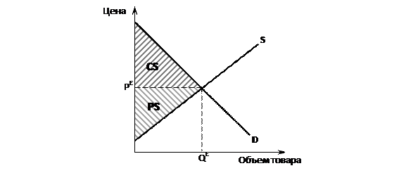 Рис. 2.10. Излишки потребителей (CS) и производителей (PS) Излишек производителя (PS) возникает потому, что в экономике действует закон убывающей предельной производительности, и издержки производства растут по мере увеличения объема производства. При этом цена устанавливается на уровне издержек производства последней единицы продукции. Графически излишек производителя выражается площадью фигуры ограниченной сверху равновесным уровнем цен, снизу – функцией предложения (см. рис. 2.10).