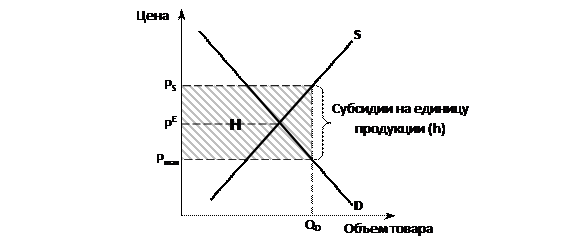 где Н – общая величина субсидий; h – субсидии на единицу продукции; QD – объем, который желают приобрести потребители по фиксированной цене; PS – цена по которой производители готовы поставить QD; Pmax - фиксированная (максимальная цена). Установление максимальной цены приводит к увеличению излишков потребителей и производителей, однако эти выгоды возникают за счет перераспределения, то есть за счет потерь третьих лиц. Минимальная цена – цена, фиксированная на уровне выше равновесной. Устанавливается в интересах производителей. Введение минимальной цены приводит к возникновению излишка продукции, который должен быть выкуплен правительством (рис. 2.12).