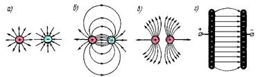 По мере удаления от заряженного тела силовые линии электрического поля располагаются реже, т. е. напряженность поля E уменьшается (рис. 3, а, б и в). Только в однородном электрическом поле (рис. 3, г) напряженность одинакова во всех его точках. Электрический потенциал. Электрическое поле обладает определенным запасом энергии, т. е. способностью совершать работу, которая может быть реализована, если внести в него какой-либо заряд. Этот заряд будет перемещаться по направлению силовых линий, совершая определенную работу. Для характеристики энергии, запасенной в каждой точке электрического поля, введено специальное понятие — электрический потенциал. Электрический потенциал φ поля в данной точке равен работе, которую могут совершить силы этого поля при перемещении единицы положительного заряда из этой точки за пределы поля. За нулевой потенциал условно принимают потенциал, который имеет поверхность земли.