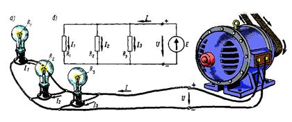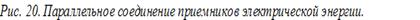 I1 = U/R1, I2 =U/R2 , I3 = U/R3 Ток в неразветвленной части цепи согласно первому закону Кирхгофа I=I1+I2 +I3 или I= U/R1 + U/R2 + U/R3 = U (1/ R1 + 1/ R2+ 1/ R3) = U/Rэкв Следовательно, эквивалентное сопротивление рассматриваемой цепи при параллельном соединении трех резисторов определяется формулой 1/ Rэкв = 1/ R1 + 1/ R2+ 1/ R3 При увеличении числа параллельно включаемых резисторов результирующее сопротивление уменьшается. При параллельном соединении приемников все они находятся под одним и тем же напряжением и режим работы каждого из них не зависит от остальных. Это означает, что ток, проходящий по какому-либо из приемников, не будет оказывать существенного влияния на другие приемники. При всяком выключении или выходе из строя любого приемника остальные приемники остаются включенными.