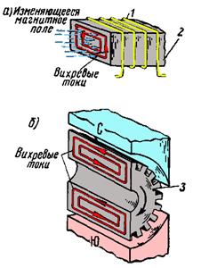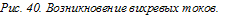 Изменяющийся магнитный поток способен индуцировать э. д. с. не только в проводах или витках катушек, но и в массивных стальных сердечниках, кожухах и других металлических деталях электротехнических установок. Эти э. д. с. являются причиной появлений индуцированных токов, которые действуют в массивных металлических деталях, замыкаясь накоротко в их толще. Такие токи получили название вихревых.