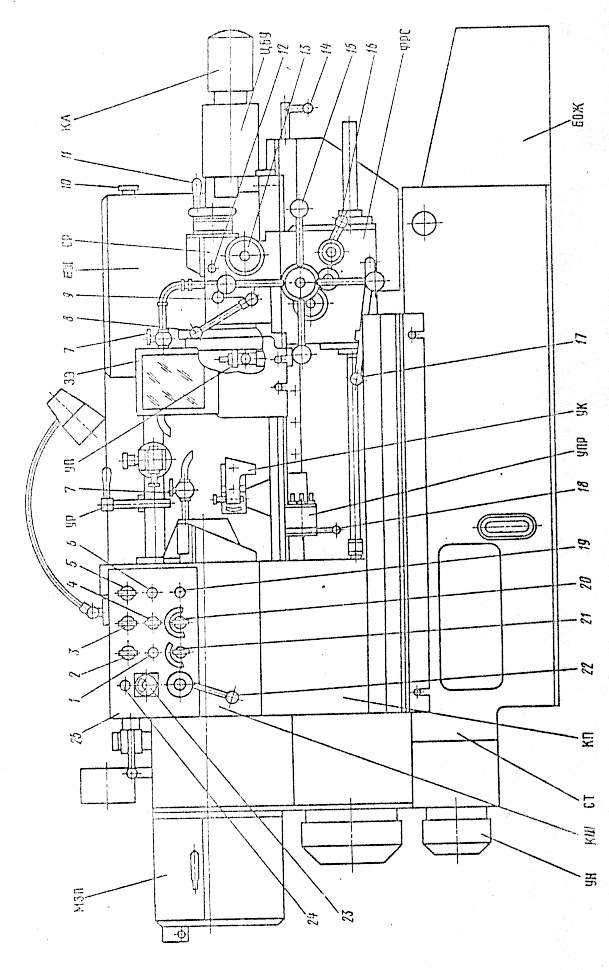Основні частини верстата (рисунок 2.1): СТ – станина; КШ – коробка швидкостей; КП – коробка подач; УН – установка насосна; МЗП – механізм затиску і подачі матеріалу; ПР – пристосування різьбонарізне; УП – упор поперечний для обмеження повороту револьверної головки; ЗЕ – захисний екран; ЕШ – електросилова шафа; СР – супорт револьверний; КА – командоапарат; ЦБУ – центральний барабан упорів; ФРС – фартух револьверного супорту; БОР – бочок для охолоджувальної рідини; ПК – пристосування для копіювання; УПО – упор поздовжній. Органи керування: 1 – кнопка вмикання електродвигуна насосу гідравліки; 2 – перемикач режимів робіт; 3 – перемикач для вмикання затиску або розтиску заготовки; 4 – перемикач для вмикання і вимикання електронасосу охолодження; 5 – перемикач пуску і зупинки шпинделя; 6 – кнопка для вмикання реверсу шпинделя; 7 – кран охолоджувальної рідини; 8 – рукоятка для фіксування і розфіксування револьверної головки; 9 – рукоятка включення реверсу поперечної подачі; 10 – рукоятка вмикання і вимикання ввідного автомату; 11 – маховик швидкого повороту револьверної головки; 12 – кнопка для вмикання і вимикання механічної поперечної подачі револьверної головки; 13 – маховик ручної поперечної подачі револьверної головки; 14 – рукоятка встановлення жорсткого упору для вимикання поздовжньої подачі; 15 – рукоятка для ручного поздовжнього переміщення револьверного супорту; 16 – рукоятка для встановлення діапазону подвійних поздовжніх подач револьверного супорту;