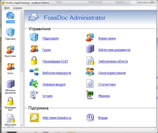 Рис. 2 – FossDoc Адміністратор. Головна сторінка Інтерфейс програми адміністрування дуже простий: зліва панель навігації з кнопками перемикання сторінок і власне сторінки, що містять інструменти для налаштування та управління системою. На головній сторінці зібрані посилання на сторінки налаштувань Системи: Підрозділи – робота з довідником підрозділів (створення / редагування підрозділів, додавання в них співробітників). Користувачі – довідник користувачів (створення нових користувачів – працівників вашої організації, редагування властивостей співробітників). Бібліотеки документів – доступ до всіх довідників і папок системи. Мережа – налаштування поштового сервера. Групи – перегляд вбудованих групп користувачів, створення і редагування власних групп користувачів. Провайдери ЕЦП – управління провайдерами ЕЦП. Заблокованіоб'єкти – перегляд заблокованих об'єктів (наприклад, документів, редагованих в поточний момент яким-небудь користувачем), зняття блокування. Шаблонимаршрутів – налаштування маршрутів документів. Сесіїкористувачів – перегляд сесій і відключення користувачів від Системи. Зовнішнімодулі – управління модулями. Статистика – налаштування виведення статистики роботи з документами. Історія – налаштування виведення історії роботи з документами. Також на даній сторінці знаходяться посилання на сайт продукту і форум технічної підтримки в інтернеті. Більш детальний опис програми FossDoc Адміністратор (див. лекцію №5). Контрольні запитання 1. Опишіть інтерфейс FossDoc Адміністратор. 2. Які елементи присутні на панелі навігації? 3. Назвіть основні структурні елементи пограми. 4. Яке призначення довідника мережа? 5. Яка основна функція FossDoc Адміністратор?