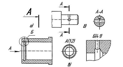 Рисунок 3.1– Правила позначення видів, розрізів та виносних елементів Частину предмета, розрізаного січною площиною, на кресленні заштриховують.