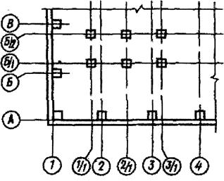 Для маркування осей на стороні будівлі з меншим їхнім числом користуються буквами українського алфавіту А, Б, В і т. д., пропускаючи З, О, И, И, Б (рис. 3.14). Буквами маркують зазвичай осі, що йдуть уздовж будівлі. Якщо для маркування осей не вистачає букв алфавіту, допускається маркування продовжувати подвоєними буквами за типом АА, ББ і т.д. Осі елементів, розташованих між розбивочними осями основних несучих конструкцій, допускається маркувати дробом Б/1, Б/2, 1/1, 2/1 і т.д. У цьому випадку в чисельнику вказують позначення попередньої координаційної осі, а в знаменнику – порядковий номер додаткової осі в межах ділянки між суміжними координаційними осями (рис. 3.14). Такими елементами є додаткові колони, вбудовані споруди, установлене обладнання. Маркування починають зліва направо для поперечних осей і знизу нагору для поздовжніх осей. Пропуски в порядковій нумерації й алфавіті при застосуванні літерних позначень не допускаються. Зазвичай маркувальні кружки (їхній діаметр 6–12 мм) розташовують із лівої і нижньої сторони плану будівель (рис. 3.14). Якщо ж розташування осей на правій і верхній стороні плану не збігається з розбивкою осей лівої й нижньої його сторін, то координаційні осі маркують на всіх сторонах плану або на тих двох сторонах, де немає збігу осей.