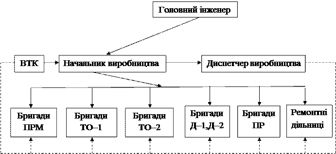 При виконанні даного підрозділу потрібно визначитись який метод ремонтно–обслуговуючого виробництва (РОВ) буде найбільш раціональним на проектованому підприємстві в даний час. На ВАТ АТП і СТОА функціонують три основні методи організації (РОВ): - метод комплексних бригад; - метод спеціалізованих бригад; - метод централізованого управління виробництвом. Для СТОА використовуються перших два метода, а для ВАТ АТП всі три. Для малих ВАТ АТП і СТОА, коли об’єми робі не значні і не вдається завантажити працівників по виконанню якогось виду робіт використовується метод комплексних бригад. В цьому випадку всі роботи виконують слюсарі–універсали високої кваліфікації. Таких комплексних бригад може бути така кількість, якої потребують назрілі обставини. Для середніх ВАТ АТП і СТОА коли об’єми робіт дозволяють завантажити ремонтних працівників використовується метод спеціалізованих бригад. В цьому випадку створюються бригади або групи ремонтних робочих, які спеціалізуються по виконанні окремих операцій в ТО і ремонті. Створюються спеціалізовані виробничі зони (ТО–1, ТО–2, ПР) а також виробничі дільниці (агрегатна, електротехнічна, акумуляторна і ін.). Для великих АТП використовується метод ЦУВ. Все виробництво по ТО і ремонту поділяється на три основних комплекси: - комплекс технічного обслуговування і діагностики (ТОД); - комплекс поточних ремонтів (ПР); - комплекс підготовки виробництв(ПВ). В комплекс ТОД входять підрозділи ТО–1, ТО–2 діагностики (Д–1 і Д–2) та ЩО. Ці підрозділи (бригади, групи робочих) виконують всі профілактичні обслуговування. В комплекс ПР входить зона ПР, де виконуються всі постові роботи ПР. В комплекс ПВ входять спеціалізовані виробничі дільниці, склади, дільниця комплектації, мийна дільниця, транспортна дільниця та ін.. Загальне управління виробництвом здійснюється централізовано центром управління. Схеми методів організації РОВ приведені нище. МЕТОД КОМПЛЕКСНИХ БРИГАД: