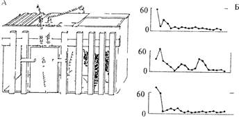 Рис. 3.4. Инструментальные УР. А — один из вариантов «проблемного ящика», предложенный Э. Торндайком для исследования способности животного к решению задачи методом «проб и ошибок»; Б — примеры кривых научения при использовании этого метода. По оси ординат — время, затраченное на решение задачи, по оси абсцисс — последовательные предъявления теста. При классических УР временная связь между условным сигналом и безусловной реакцией возникает непроизвольно при действии безусловного раздражителя (подкрепления). При инструментальных УР подкрепление, например пища, дается только после того, как животное совершает определенное действие, которое не имеет прямой связи с безусловным раздражителем.