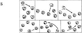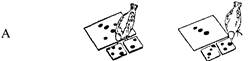 Рис. 5.1. Схема экспериментов с птицами методом выбора по образцу д _ альтернативный выбор, Б — множественный выбор по признаку «число элементов» Стрелкой отмечен стимул, соответствующий образцу (по О Келеру) В разделе 3.3 были описаны также режимы обучения, применяемые в исследованиях способности животных к обобщению и абстрагированию. Согласно первому, дифференцировочный УР или реакцию выбора по образцу вырабатывают с использованием одной определенной пары (или немногих пар) стимулов. Например, КУБ (+) делают подкрепляемым, т.е. положительным стимулом, а ШАР (-) — неподкрепляемым, т.е. отрицательным (причем оба окрашены одинаково). Когда животное достигает условного критерия ' правильных реакций (выбирает КУБ не менее чем в 80% случаев в 30 предъявлениях подряд), можно считать, что у него сформировался УР дифференцирования данных фигур по признаку формы. Сходным образом при обучении выбору по образцу на этом первом этапе также используется одна пара (или ограниченное число пар) стимулов. При этом вырабатывается частное правило выбора одного из них по сходству с данным образцом. Если образец — КУБ, то выбирать надо КУБ, а не ШАР; если образец ШАР, то выбирать надо ШАР, а не КУБ. Второй режим называют режимом систематического варьирования второстепенных параметров стимулов. Чаще всего при изучении обобщения используют именно этот метод (Koehler, 1956; Дашевс-кий, Детлаф, 1974; Wright et al., 1988). Он направлен не на выработку конкретных реакций на конкретные стимулы, а на выявление общего для многих стимулов признака и формирование единого (отвлеченного) правила выбора. При использовании этого режима животному с самого начала обучения предъявляют не одну пару стимулов, а целый их набор (set), и они различаются по всем второстепенным параметрам, кроме основного признака, подлежащего обобщению. Например, при выработке упомянутой выше дифференцировки можно использовать не одни и те же КУБ и ШАР до достижения критерия, а несколько пар таких фигур, так что каждая может отличаться от предыдущей по размеру, цвету, фактуре. Этот прием оказался особенно плодотворным при формировании у животных обобщения по относительным признакам («больше», «соответствие», «число», см. 5.5.3). Например, чтобы добиться обобщения признака «больше», с самого начала чередуют 20 пар стимулов-карточек, на каждой из которых изображено по нескольку элементов разной формы, цвета и т.п., причем на одной их количество всегда больше, чем на другой. Чтобы животное при обучении не ориентировалось на какие-то другие признаки (кроме изучаемого), набор стимулов и порядок их применения тщательно планируются заранее (см. рис. 5.3). Убедительные доказательства эффективности режима варьирования второстепенных признаков были получены, когда одну группу голубей обучали ' Условный критерий обученное™ — это принятая в данном экспериментальном протоколе доля правильных реакций животного, после достижения которой его считают «обучившимся». Условный критерий может составлять 80 или 75% правильных ответов в тесте за определенное число предъявлении. выбору по образцу с использованием различных комбинации 152 стимулов (цветных картинок), а вторую — только с двумя картинками. Для достижения принятого авторами критерия обучения (75%) птицам первой группы потребовалось более 27000 предъявлении (18 месяцев экспери