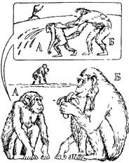 угрожает С, следовательно, С ниже рангом, чем А». Такое поведение некоторые авторы называют «социальные знания» («social cognition» Premack, 1983). Это дает основание предполагать, что у шимпанзе есть такая форма дедуктивного мышления, как способность к транзитивному заключению. Соотношение сил в группе шимпанзе постоянно меняется, и каждая особь должна всегда быть настороже, уметь оперативно оценивать особенности сиюминутной ситуации и мгновенно менять в соответствии с ними свое поведение, иначе может последовать суровое возмездие. Гудолл наблюдала, как молодой самец, уже начавший ухаживать за самкой, немедленно останавливался и принимал нейтральную позу, когда появлялся самец более высокого ранга. Преднамеренное обучение детенышей — одна из важных сторон жизни антропоидов (и других высокоорганизованных животных, в том числе дельфинов). Описано, например, как горилла-мать следила за тем, что ест ее детеныш. Она кормилась, отвернувшись от детеныша, но в тот момент, когда он положил в рот лист несъедобного растения, прекратила есть, силой вынула у него изо рта разжеванную массу и отбросила ее достаточно далеко. Многие виды обезьян кормятся пальмовыми орехами, предварительно разбивая их камнями. Навык раскалывания орехов молодые обезьяны вырабатывают постепенно. К. Бош (цит. по: Вуте, 1998) наблюдал, как шимпанзе-мать в присутствии детеныша раскалывала орехи нарочито медленно: «показывая», как это делается. При этом она специально следила за направлением взора детеныша и прекращала действия, когда тот отводил взгляд от ее рук. В обычных ситуациях («для себя») взрослые шимпанзе выполняют эти движения с такой скоростью, что за ними трудно уследить. в У человекообразной обезьяны есть понимание того, что у де- | теныша отсутствуют определенные, нужные ему знания, и она пред-в принимает специальные действия, чтобы эти знания передать. Эти примеры четко отличаются от достаточно известных проявлений инстинктивной заботы о потомстве у многих видов животных. Мартышковые обезьяны не делают попыток «исправить» неверные действия малыша, так же как все низшие узконосые обезьяны не делают этого и при использовании орудий (см. 4.5.1). Для того чтобы выяснить, могут ли мартышковые обезьяны понимать разницу между своими собственными представлениями и знаниями и представлениями других особей, Сифард и Чейни (Seyfarth, Cheney, 1980) провели специальные эксперименты. Опыт состоял в следующем. Некоторым животным группы (это были макаки-резусы и японские макаки) предоставляли определенную информацию, которой другие не обладали. Например, мать имела возможность сообщить своему детенышу о местоположении пищи или о появлении хищника, о чем тот был не осведомлен. У низших обезьян мать никак не пытается воздействовать на поведение детеныша, и, по-видимому, эти животные не принимают в расчет намерения сородичей. Такая картина вполне соответствует поведению низших обезьян в природе. Например, детеныши восточноафриканских верветок, начиная издавать крики тревоги или реагируя на сигналы других, делают много ошибок. Так, детеныш по ошибке может подать сигнал, означающий появление орла, когда видит пролетающего над головой голубя. В других случаях ошибки могут быть очень опасными, если, например, услышав сигнал о появлении змеи, детеныш будет искать врага где-то вверху. В то же