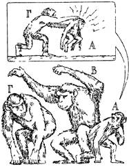 Рис. 7.7. Эпизод «социального маневрирования» (пояснения см в тексте, рисунок Т. Никитиной) ствии В — союзника Б, потому что социальный ранг его матери может быть недостаточным для победы над Б+в Однако если рядом с матерью находится ее взрослый сын или дочь, то вместе они могут устрашить и эту пару Усвоив постепенно, каковы их отношения с другими обезьянами, он замечает, как они меняются в зависимости от близости его самого и матери Так мало-помалу детеныш шимпанзе расширяет свои знания о «правилах поведения» в сообществе В результате накопления такой информации и непосредственного опыта детеныш в конце концов выучивается «правильно вести себя» в различных ситуациях и предвидеть возможное влияние поведения — его собственного и союзников на других животных. Например, если детеныш видит, что обезьяна В атакует Г, он понимает, что Г может повернуться и напасть на него самого (на рис. 7.7 это изображено как «мысленное представление» у А), т.е. переадресовать агрессию. Если А способен предвидеть такой поворот событий, то он может избежать нападения Г: не попадать под горячую руку. Более того, если А, наблюдая взаимодействия между В и Г, понял, что В старше по рангу, то он сообразит, что В — более выгодный для него союзник против Г, чем Г как союзник против В. Накапливая такой опыт, детеныш шимпанзе приобретает способность ловко лавировать в самых разных ситуациях. Подобный тип отношений называют «.социальным маневрированием» и «социальным манипулированием». Достоверно описаны ситуации, когда шимпанзе прибегают к некоторым уловкам, чтобы заставить сородича совершить нужное им действие или уклониться от нежелательного контакта или конфликта. С помощью таких уловок обезьяны достигают успеха в разных ситуациях. • мать может отвлечь капризного детеныша от опасного действия; » зачинщик беспорядков переадресует гнев доминанта на ни в чем не повинного сородича, а сам избегает справедливого наказания; • обезьяна может предупредить конфликт и даже драку, отвлекая внимание соперников с помощью только что придуманной инсценировки, • обезьяна, знающая источник пищи, может увести от него сородичей и затем воспользоваться им в одиночку и т.п. Из многих описанных Дж Гудолл случаев упомянем о поведении молодого самца по кличке Фиган, который регулярно прибегал к самым разнообразным формам обмана сородичей в разных ситуациях Особенно ярко проявились его способности, когда шимпанзе, приходивших в лагерь, стали регулярно подкармливать бананами с помощью особой кормушки. Чтобы открыть ее, нужно было отвинтить гайку и освободить рукоятку, тогда натяжение проволоки, фиксирующей крышку, ослабевало и кормушка открывалась. Беда была в том, что рукоятка была удалена от кормушки' и открывшая ее обезьяна чаще всего не могла воспользоваться добычей, так как ее перехватывали «иждивенцы» — расположившиеся рядом с кормушкой взрослые самцы. Из двух подростков, овладевших навыком открывания кормушки, только Фиган догадался, как обмануть «иждивенцев» Изображая полное безразличие, он потихоньку откручивал гайку, но делал вид, что не обращает на нее никакого внимания При этом он незаметно придерживал рукой или ногой рукоятку, чтобы крышка не открылась раньше времени Иногда он просиживал так более получаса, дожидаясь, пока разойдутся разочарованные конку