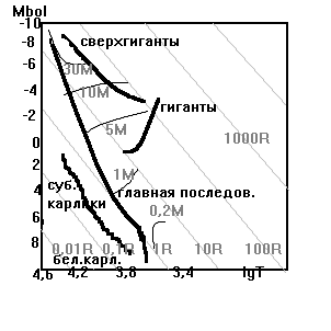 Отложим по одной оси абс. болометрическую зв. величину и логарифм зв. температуры по другой. На такой диаграмме положение всех звёзд, имеющих одинаковые радиусы, изобразится прямыми линиями, т.к. зависимость между lgL и lgT линейная. На рисунке показаны линии постоянных радиусов, позволяющие легко найти размеры звезды по её светимости и спектру. Радиусы различных звёзд меняются в больших пределах: от сотен и тысяч радиусов Солнца до тысячной доли радиуса Солнца. Главная последовательность и последовательность сверхгигантов изобразились почти прямыми линиями. Это позволяет установить для данных звёзд эмпирическую зависимость между болометрической светимостью и радиусом. Для звёзд главной последовательности выполняется формула: