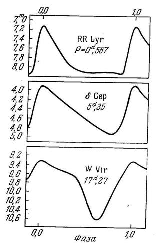 По этой зависимости определяют расстояния до далёких объктов, когда не могут быть применены иные методы. Сложность заключается в том, что очень трудно найти нуль-пункт расположения прямых на диаграмме из-за того, что тригонометрическими методами не измерены расстояния ни до одной из цефеид. К настоящему времени в нашей Галактике известно свыше 700 цефеид. Цефеиды делятся на группы: 1. Дельта цефеиды (Сd) или классические цефеиды. Для этих звёзд характерна зависимость между периодом и формой кривой блеска, открытая и изученная Э. Герцшпрунгом. У цефеид с периодами в пределах от 1, 5 до 5 суток кривая изменения блеска гладкая, при более продолжительных значениях периода появляется “горбик” на нисходящей ветви кривой блеска, который постепенно перемещается к максимуму. Таким образом по величине периода и форме кривой блеска можно отличить дельта-цефеиду от других объектов. Это молодые объекты, расположенные вблизи основной плоскости Галактики. 2. Цефеиды типа W Девы (W - цефеиды, CW). Эти звёзды не вписываются в закономерности обычных цефеид, расположены далеко от плоскости Галактики и намного старше. Они встречаются в шаровых звёздных скоплениях и принадлежат к сферической составляющей Галактики. Эти звёзды горячее всего не в максимуме, а на середине подъёма блеска. 3. Малоамплитудные цефеиды - дзета (Сz). типичный представитель - звезда z Близнецов. Они обладают симметричными кривыми блеска и расположены в пространстве вблизи центральных областей спиральных ветвей Галактики. Звёзды типа RR Лиры. Это гиганты спектрального класса А. Они занимают узкий участок на диаграмме Герцшпрунга-Рэссела, соответствующий почти одинаковой для всех светимости. Периоды этих звёзд лежат в пределах от 0, 2 до 1, 2 суток. Они очень быстро меняют блеск. Амплитуда изменения блеска достигает 1 зв. величины. У всех звёзд этого типа изменяются лучевые скорости, что свидетельствует о пульсационных изменениях радиуса. Во время быстрого роста блеска в водородной оболочке возникает ударная волна и появляются яркие эмиссионные линии в спектре. Синхронно с блеском меняются и показатели цвета, что вызвано изменением температуры фотосферы. В максимуме блеска звезда горячее и белеет. Много таких звёзд в шаровых скоплениях, среди них многие обладают переменными периодами (эффект Блажко). У этих звёзд также как и у цефеид существует зависимость между периодом и светимостью. Карликовые цефеиды. Эти звёзды обладают очень малым периодом изменения блеска от 0 d, 055 до 0 d, 2. Амплитуды колебания блеска невелики - от 0, 2 до 0, 7 зв. величин. Спектры этих звёзд класса А, светимости небольшие - от +4 до +2. Долгопериодические переменные (мириды). Звёзды типа о Кита. Амплитуды изменения блеска могут достигать 10 зв. величин. Периоды очень разнообразны и могут быть от 90 до 730 суток. Это красные звёзды спектральных классов M, S, N. По большим светимостям они относятся к классу сверхгигантов. Механизм пульсации у этих звёзд несколько иной чем у цефеид. Переменность блеска вызвана колебанием температуры. При понижении температуры атомы объединяются в молекулы. Молекулы активнее поглощают излучение, чем свободные атомы, и прозрачность внешних слоёв понижается, что приводит к ослаблению блеска. Энергия задерживается во внутренних слоях и постепенно накапливается, что приводит к разогреванию. При