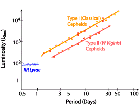 При изменении средней плотности должен меняться период. Была установлена также зависимость между периодом и светимостью у цефеид. Эта зависимость линейная. Чем больше период, тем больше светимость и абсолютная звёздная величина.
