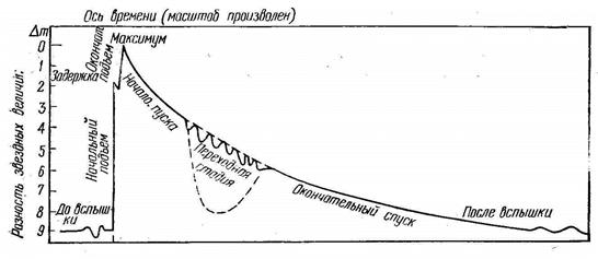 Всего известно около 300 новых звёзд, из них около 150 вспыхнуло в нашей Галактике и свыше 100 в туманности Андромеды. У известных семи повторных новых наблюдалось около 20 вспышек. Вспышки происходят примерно раз в 100 лет. Многие, если не все новые являются тесными двойными звёздами. После вспышки часто обнаруживают слабую переменность. При вспышке начальный подъём блеска происходит очень быстро, за 2-3 суток. Незадолго до максимума рост светимости несколько замедляется (окончательный подъём). После максимума происходит уменьшение светимости, длящееся годы. Падение блеска на первые три зв. величины плавное. Затем следует переходная стадия, отличающаяся либо плавным уменьшением светимости ещё на три величины, либо колебаниями её. Окончательное падение блеска происходит плавно, и звезда приобретает ту светимость, что имела ранее. Во время вспышки происходит внезапный взрыв, вызванный неустойчивостью, возникающей в звезде. Эта неустойчивость может возникать у некоторых горячих звёзд в результате внутренних процессов, определяющих выделение энергии в звезде, либо вследствие воздействия каких-либо внешних факторов. Причиной взрыва новой может являться обмен вещества между компонентами тесных двойных систем. Если богатое водородом вещество из оболочки главной звезды попадёт на поверхность её спутника - белого карлика, может произойти внезапное выделение термоядерной энергии. Эта энергия очень велика, но всё же неизмеримо меньше общих запасов энергии звезды, поэтому взрыв новой не сопровождается изменением общей её структуры, а затрагивает толко приповерхностные слои. Следствием нагрева газа, происходящего в результате взрыва, является выброс звездой вещества, приводящий к отрыву от неё внешних слоёв - оболочки массой 0, 0001 Msol. Эта оболочка расширяется с огромной скоростью до 2000 км/с. Об этом свидетельствуют доплеровские смещения спектральных линий в фиолетовую сторону спектра. Звезда быстро сбрасывает оболочку и в результате образует вокруг себя туманность. Расширяющиеся газовые туманности были обнаружены почти у всех близких новых. Зная расстояние до новой звезды, можно определить её начальную и максимальную светимость, а также оценить радиус до вспышки и максимальный радиус. Сверхновые - это звёзды, вспыхивающие подобно новым и достигающие в максимуме абс. зв. величины от -18 m до -21m. Возрастание светимости происходит в десятки миллионов раз, более чем на 19 m. Общая энергия, излучаемая сверхновой за время вспышки превышает в тысячи раз энергию новых звёзд. Название “сверхновая” было дано в 1934 году американцами Цвикки и Бааде. Фотографически зарегистрировано более 300 вспышек сверхновых в других галактиках. Нередко светимость сверхновых была сравнима с интегральной светимостью всей галактики, в которой произошла вспышка. Так например, в 1895 году наблюдалась сверхновая в галактике NGC 5253. Звезда была 7, 2 m, а сама галактика 12 m. Одна звезда излучала в 100 раз больше, чем все звёзды галактики! По грубым подсчётам Цвикки сверхновые вспыхивают в галактике примерно один раз в 360 лет. По летописям выявлено, что в нашей Галактике тоже было несколько вспышек сверхновых звёзд. Эту работу проделал шведский астроном Лундмарк. За последние 1000 лет наблюдалось по крайней мере 6 сверхновых: в 1006, 1054, 1181, 1572, 1604, 1667 годах. Самые известные - это свер
