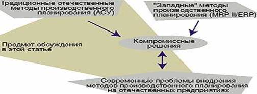 Например, В отделе АСУ завода работала общезаводская система, которая формировала техпромфинплан, производственные программы, а также оперативные (на декаду или на месяц) планы для цехов. Оперативный учет тоже велся по месяцам или декадам. Потребителями этой плановой информации были дирекция, службы снабжения и сбыта, управления предприятия, бухгалтерия. Нормативная информация была также укрупненная, например с технологическим маршрутом, составленным по цеховым переделам. С другой стороны, для цехов такой детализации планирования не хватало. Например, для единичного и мелкосерийного производства непосредственно в цехах вынужденно создавались свои системы организационно-технологического управления, оперативного планирования и диспетчирования. В рамках этих систем велось формирование сменных заданий, планирование переналадок технологического оборудования, работа транспортно-складских систем и учет хода производства. В некоторых случаях в технологическом бюро цеха появлялся свой комплект технологической документации на изделия (сначала — более детальный, чем в отделе АСУ, а со временем и отличающийся по описаниям технологического оборудования, по нормам времени и расхода материалов). Служб, в производственные обязанности которых входило бы согласование «заводского» и «цехового» комплектов нормативной и технологической информации систем оперативного планирования, не было. По цеховым системам велось управление ходом производства в цехе, а межцеховые передачи заказов, управление складом готовой продукции, расчет зарплаты, материально-техническое снабжение велись централизованно в рамках АСУ. Аналогичный разрыв систем возникал в цепочке обратных связей планирования — в подсистеме учета и отчетности. Учетные данные порождались в цеховой системе и использовались для очередных периодов оперативного планирования и диспетчирования. В то же время учетные и отчетные данные в интегрированном виде должны были представляться в заводскую систему планирования. В результате разделения систем планирования управленческий персонал цеха воспринимал цеховую систему как свой инструмент, а укрупненную систему планирования АСУ — как средство внешнего контроля и не был заинтересован в предоставлении «наверх» актуальной информации.